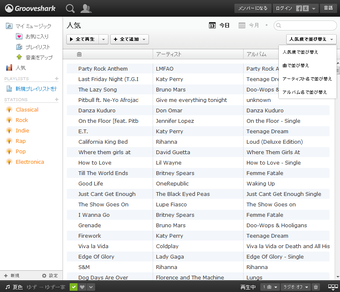 Groovesharkの画面は「マイミュージック」や「プレイリスト」、「ロック」「インディーズ」などのラジオステーションが左側に並び、iTunesを彷彿させるインターフェースです。「Search the Music」で楽曲やアーティスト名を入力します。日本語での邦楽検索にも対応しています。Groovesharkでは「人気ランキング」やラジオステーションも用意されているので、新しいジャンルの曲や流行りの楽曲にも気軽に試すことができます。